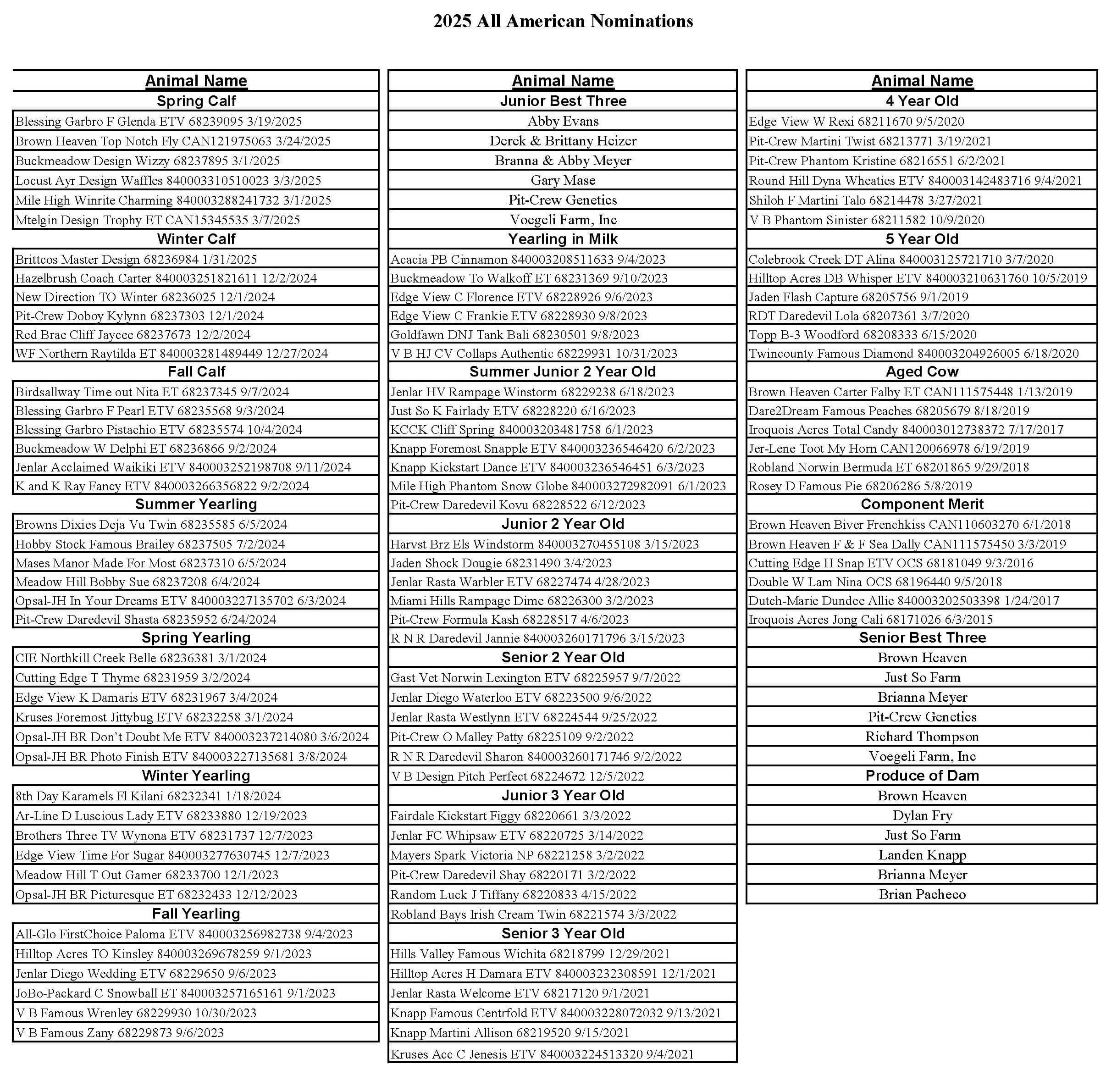 Each All-American entry must be accompanied by a $50 entry fee made out to the Brown Swiss Association. Entries must be postmarked or e-mailed on or before November 15. All photos should be sent to the national office or e-mailed to ahorn@brownswissusa.com and must be received by midnight November 15.